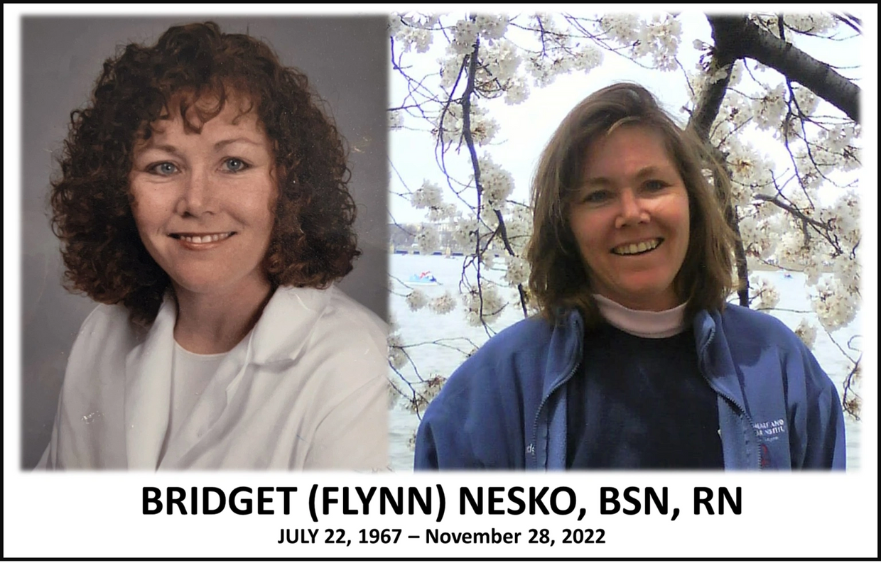 Bridget Flynn Nesko, BSN, RN, was a brilliant and accomplished registered cardiac nurse and healthcare educator, publisher, radio broadcaster, voice-over artist, entrepreneur, community activist, wife, mother, grandmother, daughter, sister, sister-in-law, aunt, cousin and friend. She cared deeply for her family, friends and patients, as well as for total strangers in need of assistance.